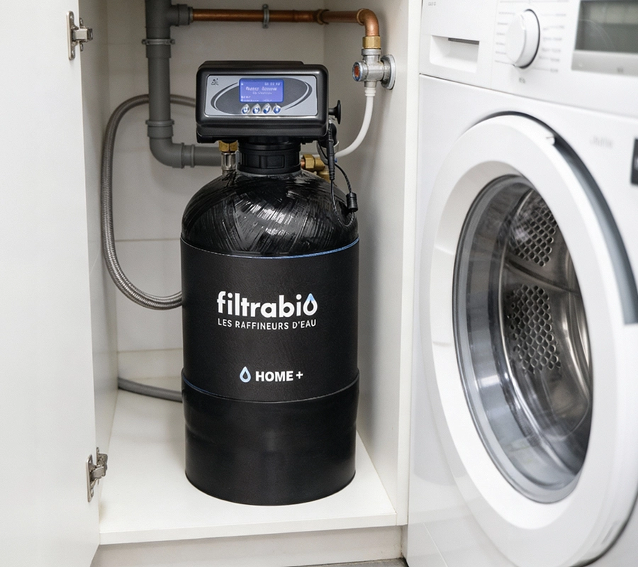 Configuration optimale : Adoucisseur sur eau chaude (zéro trace) + Filtrabio sur eau froide (eau de qualité) = le meilleur des deux mondes.